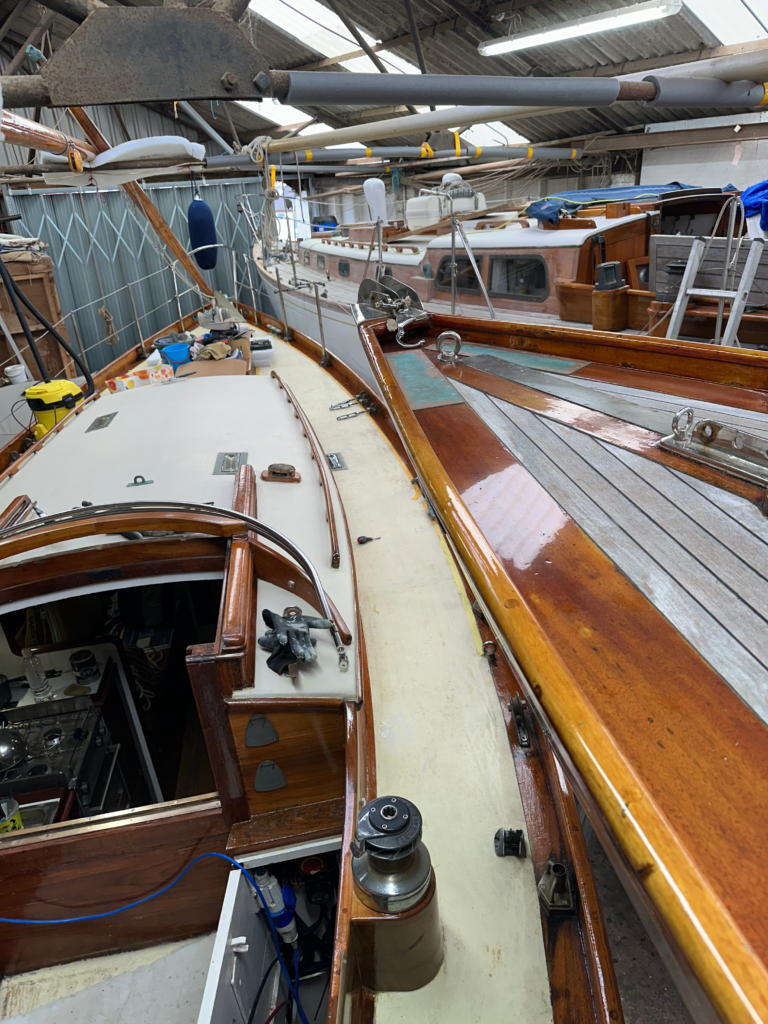 - In 2020, as a consequence of the Covid 19 pandemic lockdown the yacht was significantly late into the water and the carvel hull planks had dried out more than normal. On launching leaks occurred in new and unusual places giving rise to some brown stains in the lockers.